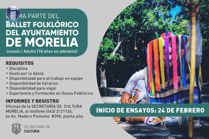 NOTICIAS 21/02/2022SeCultura invita a ser parte del Ballet Folklórico del Ayuntamiento de MoreliaLa Secretaría de Cultura de Morelia (SeCultura), convoca a todas y todos los interesados en preservar, difundir y proyectar las tradiciones dancísticas de la entidad, a formar parte de la primera generación del Ballet Folklórico del Ayuntamiento de Morelia.