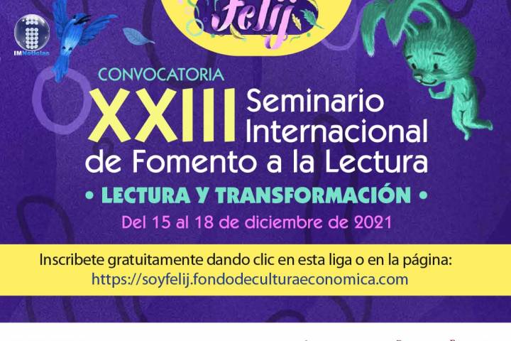 NOTICIAS 08/12/2021Invitan al XXIII Seminario Internacional de Fomento a la Lectura, Lectura y TransformaciónEl gobierno de México invita a todas las personas y organizaciones que realicen o se interesen por el fomento a la lectura en cualquier parte del país e Iberoamérica, a participar en el XXIII Seminario Internacional de Fomento a la Lectura, Lectura y Transformación, el cual se llevará a cabo de manera virtual del 15 al 18 de diciembre, en el marco del Festival de Literatura Infantil y Juvenil FELIJ 2021.