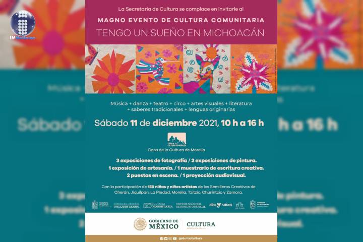 NOTICIAS 08/12/2021Llega a Morelia el 1er Encuentro de Semilleros Creativos de MichoacánEste sábado 11 de diciembre, a partir de las 10 y hasta las 16 horas los municipios de Cherán, Jiquilpan, la Piedad, Morelia, Tzitzio, Churintizo y Zamora, mostrarán en la Casa de la Cultura de Morelia los resultados de los Semilleros Creativos del estado bajo el nombre "Tengo un Sueño en Michoacán", promovido por la Secretaría de Cultura Federal, como parte del evento anual "Tengo un Sueño" realizado en la Ciudad de México.