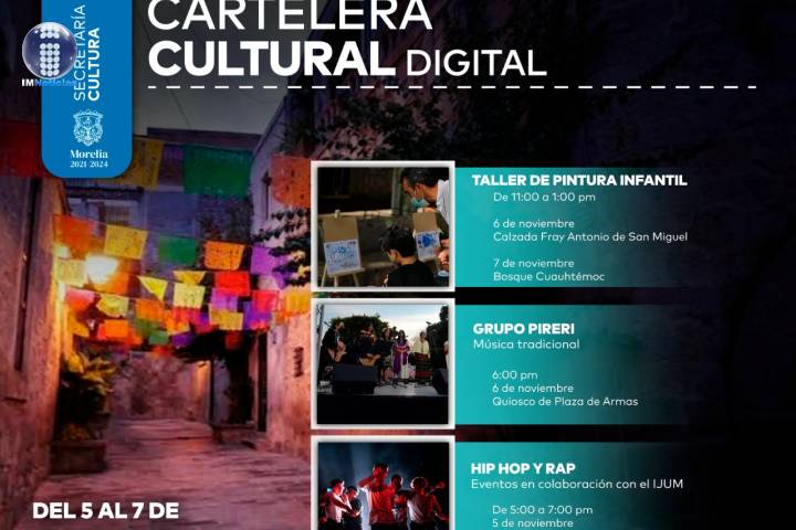 NOTICIAS 05/11/2021Callejoneada, boleros, danza, y pintura, entre las activaciones de SeCultura este fin de semanaEn Morelia se vive la cultura, y este fin de semana la administración municipal del alcalde Alfonso Martínez Alcázar, a través de la Secretaría de Cultura de Morelia (SeCultura), que dirige Fátima Chávez Alcaraz, presenta para el gusto de toda la ciudadanía, una amplia actividad artística en distintas plazas del Centro Histórico.