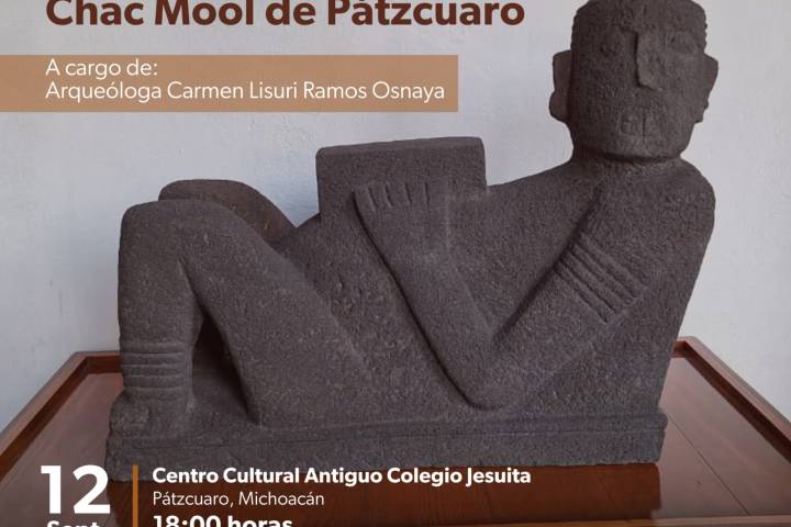 NOTICIAS 11/09/2025Secum invita a la conferencia que narrará el descubrimiento del Chac Mool de PátzcuaroLa Secretaría de Cultura de Michoacán invita a la conferencia "El descubrimiento del Chac Mool de Pátzcuaro", que impartirá la arqueóloga Carmen Lisuri Ramos Osnaya, este viernes 12 de septiembre a las 18:00 horas en el auditorio del Centro Cultural Antiguo Colegio Jesuita de Pátzcuaro.