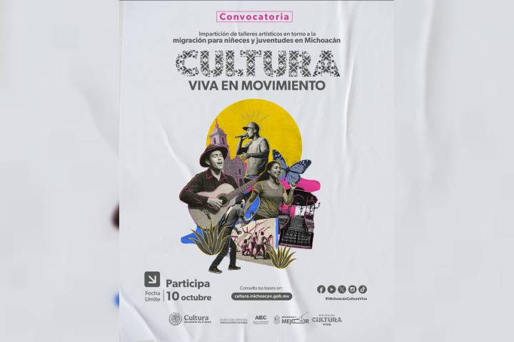 NOTICIAS 23/09/2025Con inversión de 1.5 mdp, Secum lanza convocatoria para talleres dirigidos a niñeces y juventudesLa Secretaría de Cultura de Michoacán (Secum) presentó la convocatoria "Cultura Viva en Movimiento", con el objetivo de impulsar talleres artísticos en torno a la migraciones, dirigidos a niñeces y juventudes del estado. La secretaria Tamara Sosa destacó que se trata de un proyecto conjunto con el Gobierno de México que tiene una inversión superior a un millón y medio de pesos para su ejecución.