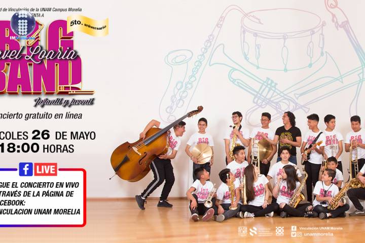 NOTICIAS 20/05/2021UNAM Morelia presenta a Pavel Loaria Big Band Infantil y Juvenil en concierto de aniversarioCon una experiencia acompañada de constancia, talento y disciplina, que los ha llevado a presentarse en festivales internacionales y a compartir el escenario con destacados músicos, "Pavel Loaria Big Band Infantil y Juvenil", llega a su 5° aniversario y como parte de sus festejos se presentará en un concierto el próximo 26 de mayo, a las 18:00 horas, con acceso gratuito a través del Facebook: Vinculación UNAM Morelia