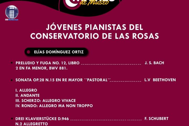 NOTICIAS 21/04/2021Bach, Beethoven y Schubert en las redes de Clavijero El sonido del llamado "rey de los instrumentos", el piano, se escuchará dentro del ciclo "Jóvenes pianistas del Conservatorio de las Rosas", proyecto desarrollado por dicha institución educativa, en conjunto con la Secretaría de Cultura de Michoacán, a través del Centro Cultural Clavijero, que ofrecerá su siguiente programa hoy a las 6 de la tarde vía online.