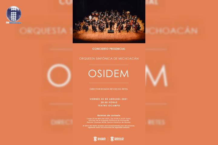 NOTICIAS 28/04/2021Osidem regresa al Teatro OcampoUn concierto presencial es el que ofrecerá la Orquesta Sinfónica de Michoacán (Osidem), el próximo 30 de abril en el Teatro Ocampo, a las 8:30 de la noche, siguiendo todos los protocolos de seguridad sanitaria.