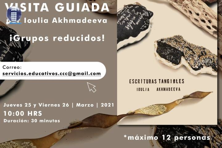 NOTICIAS 23/03/2021 En Clavijero, visita guiada por la muestra "Escrituras Tangibles"Ioulia Akhmadeeva, creadora de la exposición "Escrituras Tangibles" que alberga el Centro Cultural Clavijero (CCC), ofrecerá al público un par de visitas guiadas el 25 y 26 de marzo a las 10 de la mañana.