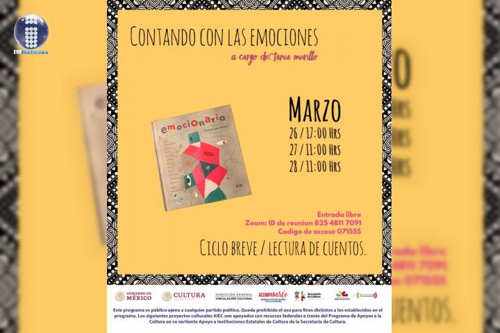 NOTICIAS 24/03/2021Invitan a los más pequeños a ciclo de lectura de cuentos en línea En el marco de las festividades del Día Mundial del Teatro 2020, del 26 al 28 de marzo, niñas y niños podrán participar de manera virtual y gratuita en el ciclo de lectura de cuentos "Contando con las emociones", que estará a cargo de Tania Murillo Tovar, directora de Zinnia Compañía Escénica, con apoyo de las secretarías de Cultura Federal y del Estado de Michoacán.