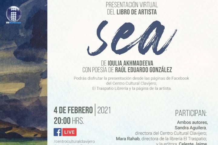 NOTICIAS 04/02/2021Presentarán libro de artista en redes sociales de Clavijero Narrativa de viaje generada por la imagen y la palabra, el libro de artista "SEA", de Ioulia Akhmadeeva, será presentado en línea este 4 de febrero a las 8 de la noche, con auspicio de la Secretaría de Cultura de Michoacán, a través del Centro Cultural Clavijero (CCC) y Traspatio Librería.