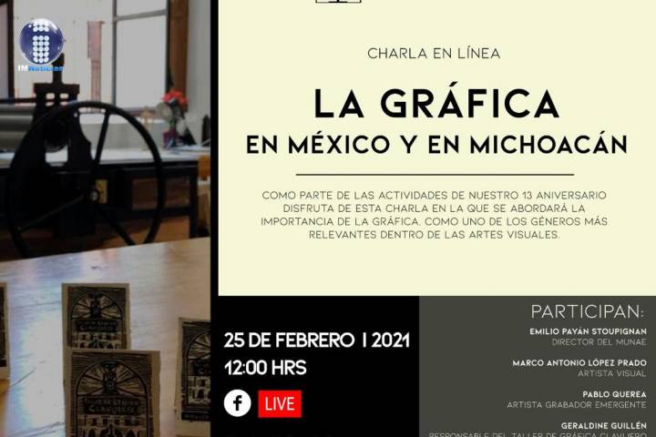 NOTICIAS 15/02/2021En línea, charla sobre la gráfica en México Como parte de las actividades organizadas en el marco del 13º aniversario del Centro Cultural Clavijero, la Secretaría de Cultura de Michoacán invita al público a disfrutar de la charla en línea "La Gráfica en México", el próximo 25 de febrero, a mediodía.
