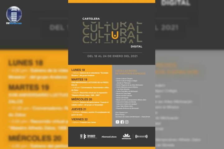 NOTICIAS 18/01/2021 Regresa la Cartelera Cultural Virtual de la SecumCon la finalidad de ofrecer actividades culturales de forma responsable y que lleguen a la población sin salir de casa, la Secretaría de Cultura de Michoacán (Secum), anuncia el regreso de la Cartelera Cultural Virtual, que se puede consultar en todas sus redes sociales.