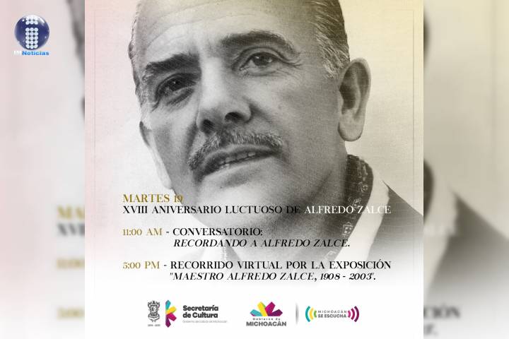 NOTICIAS 18/01/2021Con conversatorio y recorrido virtual conmemoran 18 años de la partida de Alfredo Zalce En el marco del 18 aniversario luctuoso del artista michoacano Alfredo Zalce, este 19 de enero la Secretaría de Cultura de Michoacán realizará el conversatorio "Recordando a Alfredo Zalce" a las 11 de la mañana y el recorrido virtual por la exposición "Maestro Alfredo Zalce, 1908 - 2003", a las 5 de la tarde. Ambas actividades se podrán seguir a través de su página de Facebook.