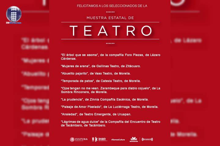 NOTICIAS 22/12/2020Anuncian a seleccionados de la Muestra Estatal de Teatro Con la finalidad de que las compañías, grupos, colectivos y/o artistas de teatro con trayectoria y calidad artística en el Estado puedan mostrar su trabajo y ampliar públicos, la Secretaría de Cultura de Michoacán anuncia a los seleccionados de la Muestra Estatal de Teatro, dentro del programa "FomenARTE 2020":