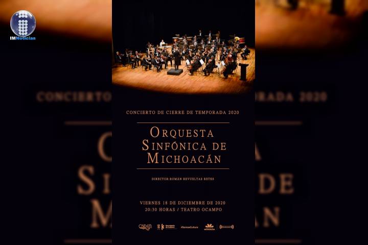 NOTICIAS 15/12/2020Invitan al último concierto del año de la Sinfónica de Michoacán Como cierre de la temporada 2020, bajo la conducción de su director Román Revueltas Retes, la Orquesta Sinfónica de Michoacán ha organizado un concierto presencial, que se llevará a cabo el 18 de diciembre a las 8:30 de la noche, en el Teatro Ocampo.