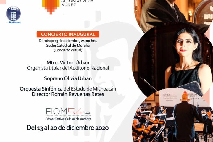 NOTICIAS 09/12/2020Será virtual el Festival Internacional de Órgano de Morelia Considerado un referente de la música de concierto en los cinco continentes, el 54° Festival Internacional de Órgano de Morelia (FIOM), "Alfonso Vega Núñez", se llevará a cabo del 13 al 20 de diciembre de manera virtual, con conciertos y conferencias magistrales, y el apoyo de la Secretaría de Cultura de Michoacán.