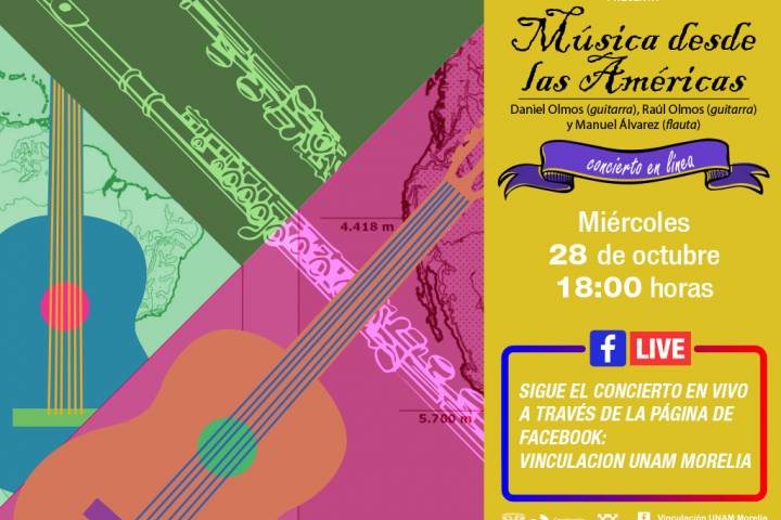 NOTICIAS 25/10/2020Música desde las AméricasAl continuar con el Programa Artístico a Distancia de UNAM Campus Morelia, en esta ocasión se presentará el espectáculo "Música desde las Américas", concierto de Guitarra y Flauta, el próximo 28 de octubre, a las 18:00 horas, con acceso gratuito a través de la transmisión en línea desde el Facebook: Vinculación UNAM Morelia.