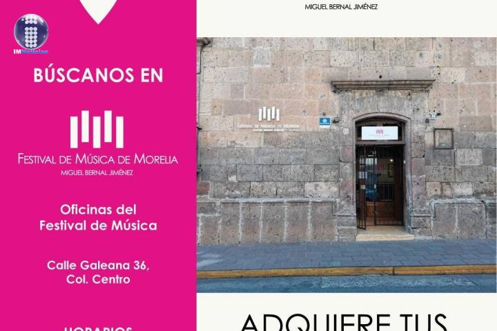 NOTICIAS 26/10/2020Inicia la venta de boletos del Festival que con música, cambiará tu vidaCon música la vida cambia, y después de varios meses alejados de las actividades culturales presenciales, el Festival de Música de Morelia Miguel Bernal Jiménez llega para ofrecer a la ciudadanía la alegría, recuerdos y buenos momentos que las notas musicales, canciones y letras generan en las personas.