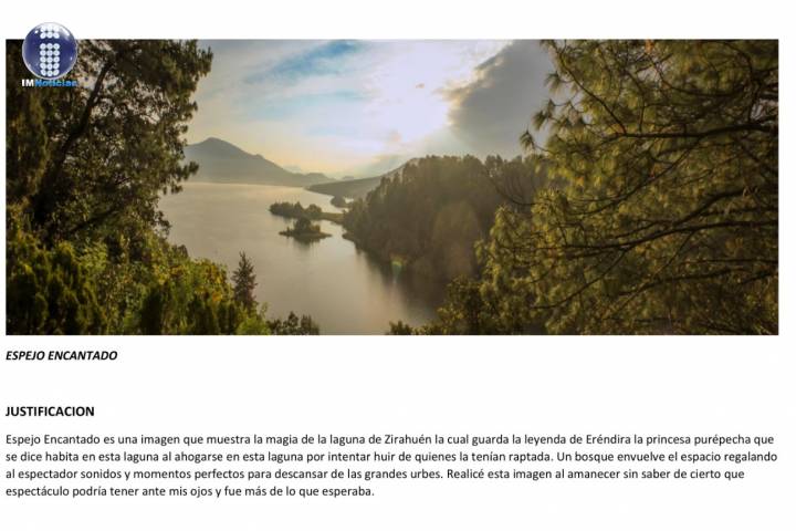 NOTICIAS 27/10/2020Eligen a nueva ganadora del concurso de Fotografía / Paisaje 2020 Tras una segunda liberación, y al seguir los lineamientos de la convocatoria, el jurado determinó otorgar el Primer Premio en la categoría mayores de 35 años a "Espejo Encantado", autoría de América Arzate, dentro del Concurso de Fotografía / Paisaje 2020, organizado por la Secretaría de Cultura de Michoacán.