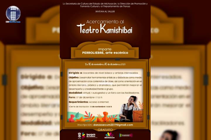 NOTICIAS 27/10/2020Invita Secum al taller virtual de Teatro KamishibaiA partir del 16 de noviembre, por espacio de un mes y de manera gratuita, los docentes de nivel básico y artistas interesados podrán cursar el taller virtual "Acercamiento al Teatro Kamishibai", que impartirá la Compañía PERRO LIEBRE, Arte Escénico, con apoyo de la Secretaría de Cultura de Michoacán (Secum).