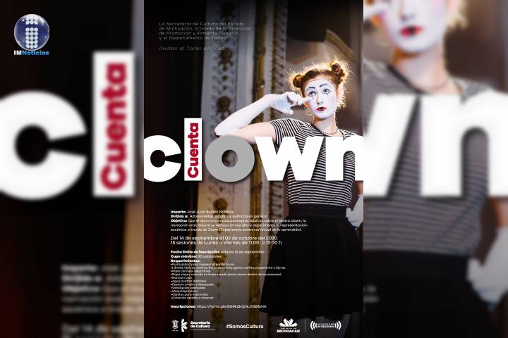 NOTICIAS 17/09/2020Arranca taller de teatro Cuenta ClownCon participantes de la Ciudad de México, Xalapa, Veracruz, y de los municipios michoacanos de Morelia, Zitácuaro y Lázaro Cárdenas, dio inicio el taller de teatro Cuenta Clown, bajo el auspicio de la Secretaría de Cultura de Michoacán.