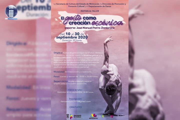 NOTICIAS 07/09/2020"El gesto como creación escénica", taller gratuito en línea"El gesto como creación escénica" es el nombre del taller en línea que llevará a cabo la Secretaría de Cultura de Michoacán (Secum), del 10 al 30 de septiembre, jueves y viernes de 6 de la tarde a 8 de la noche, de forma gratuita.
