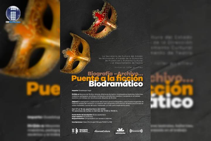 NOTICIAS 27/08/2020Abren inscripciones al taller en línea sobre trabajo escénico Personas interesadas en el trabajo escénico podrán participar en el taller en línea "Puente a la ficción-Biodramático", que la Secretaría de Cultura de Michoacán realizará del 7 al 18 de septiembre, de lunes a viernes, de 5 a 7:30 de la tarde.