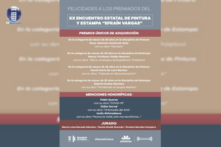 NOTICIAS 24/08/2020Premian a artistas del XX Encuentro Estatal de Pintura y Estampa EfraÃn Vargas Con la finalidad de reconocer a los talentos de Michoacán se llevó a cabo en lÃnea la premiación del XX Encuentro Estatal de Pintura y Estampa EfraÃn Vargas, a través de las redes sociales de la SecretarÃa de Cultura de Michoacán (Secum), donde se anunció a los cuatro artistas ganadores y las tres menciones honorÃficas.