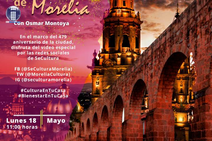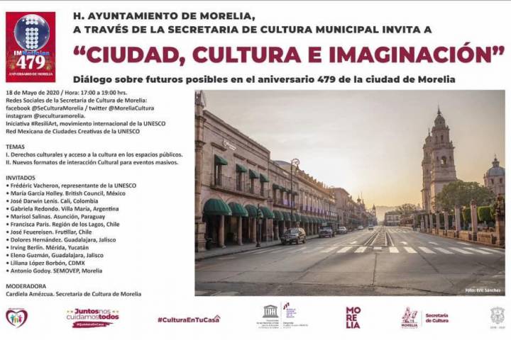 NOTICIAS 16/05/2020Morelia reunirá virtualmente a expertos gestores culturales de LatinoaméricaEl 18 de mayo, de las 17:00 a las 19:00 horas, el Gobierno de Morelia a través de la Secretaría de Cultura Municipal realizará el diálogo virtual ?Ciudad, Cultura e Imaginación', primero a nivel Latinoamérica que nace desde Morelia, y llega en el marco del aniversario 479 de la ciudad.
