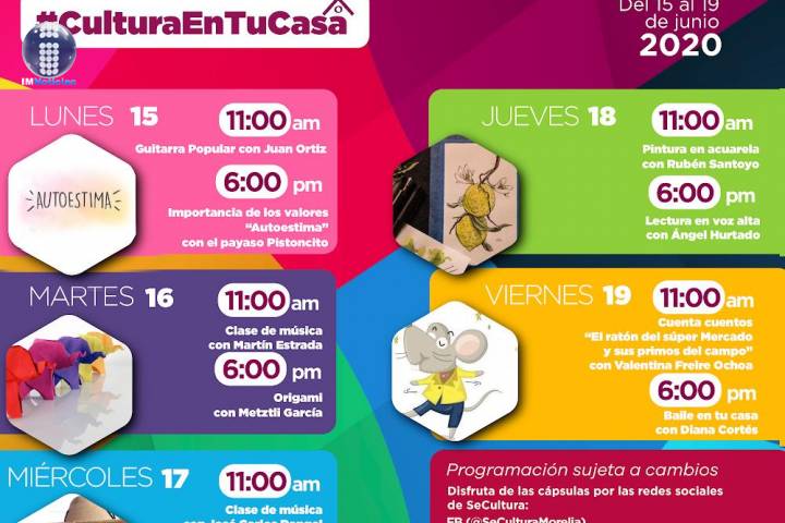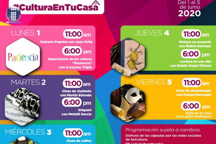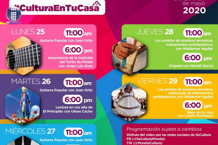 NOTICIAS 25/05/2020Música, baile y lectura, esta semana en #CulturaEnTuCasaMúsica, baile, lectura en voz alta, origami y danza folklórica, son parte de las cápsulas creativas que la Secretaría de Cultura de Morelia presenta en la semana del 25 al 29 de mayo, en la cartelera digital de #CulturaEnTuCasa.