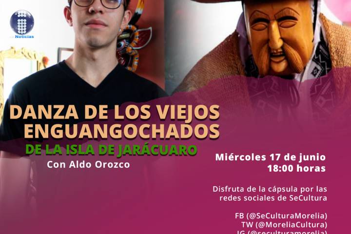 NOTICIAS 16/06/2020La Danza de los Viejos Enguangochados de la Isla de Jarácuaro, llega a #CulturaEnTuCasaLa transmisión de saberes culturales y los legados dancísticos se mantienen presentes en el programa virtual #CulturaEnTuCasa del Gobierno de Morelia desarrollado por la Secretaría de Cultura Municipal, y este miércoles 17 de junio, Aldo Orozco Rueda, bailarín con más de 10 años en los escenarios, compartirá la cápsula creativa en la que hablará de la Danza de los Viejos Enguangochados de la Isla de Jarácuaro.