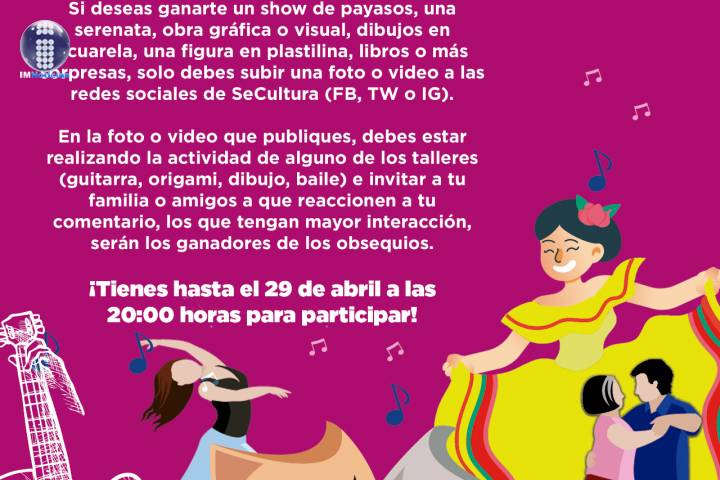 NOTICIAS 14/04/2020Participa y gana con #CulturaEnTuCasaYa sea guitarra, danza folklórica, teatro, dibujo, baile, origami, manualidades, o cualquiera de las actividades que sigas en el programa #CulturaEnTuCasa que desarrolla el Gobierno de Morelia a través de la Secretaría de Cultura, te podrá dar un regalo.