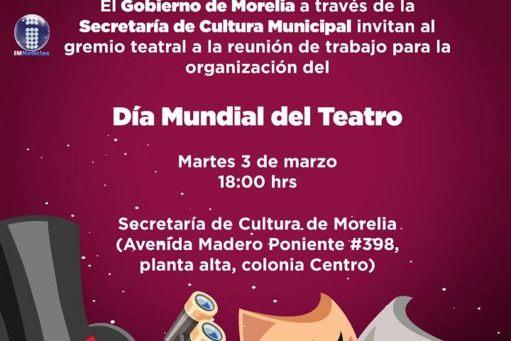 NOTICIAS 02/03/2020SeCultura invita a gremios de danza y teatro para preparar el DÃa Internacional de la Danza y el TeatroPara entregar a la ciudadanÃa momentos de convivencia familiar a través de la cultura y las artes, el Gobierno de Morelia a través de la SecretarÃa de Cultura Municipal invitan al gremio de teatro y de danza a las reuniones de trabajo que se realizarán el martes 4 y miércoles 5 de marzo, para la organización del DÃa Mundial del Teatro, y del DÃa Internacional de la Danza, respectivamente.