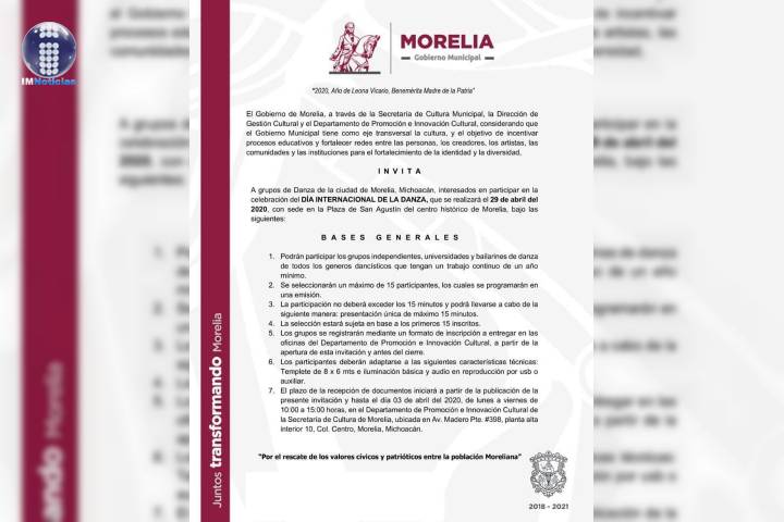 NOTICIAS 10/03/2020Llama SeCultura a artistas para el DÃa Internacional de la Danza[16:11, 10/3/2020] Felipe Barcenas: El Gobierno de Morelia, a través de la SecretarÃa de Cultura Municipal, invita a los grupos de danza de la ciudad, a participar en la celebración del DÃa Internacional de la Danza, que se realizará el 29 de abril del 2020 en la Plaza de San AgustÃn.