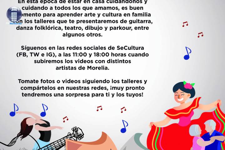 NOTICIAS 19/03/2020#CulturaEnTuCasa, el programa de arte comunitario por Internet al que invita SeCultura En la etapa de sana distancia para el cuidado de todos y evitar la propagación del coronavirus, el Gobierno de Morelia a través de la SecretarÃa de Cultura Municipal motiva la convivencia familiar y lanza el proyecto #CulturaEnTuCasa, con el cual las personas podrán compartir experiencias artÃsticas dirigidas por artesanos y artistas de Morelia.