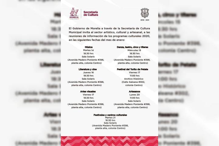 NOTICIAS 13/01/2020Llama SeCultura al sector artístico, artesanal y cultural a reuniones Con el propósito de generar procesos colaborativos entre ciudadanía y Gobierno de Morelia, la Secretaría de Cultura Municipal hace una invitación al sector artístico, cultural y artesanal, para que asistan a las reuniones de información sobre los programas municipales en materia cultural, que iniciarán el próximo martes 14 de enero y concluyen el martes 21 de enero.