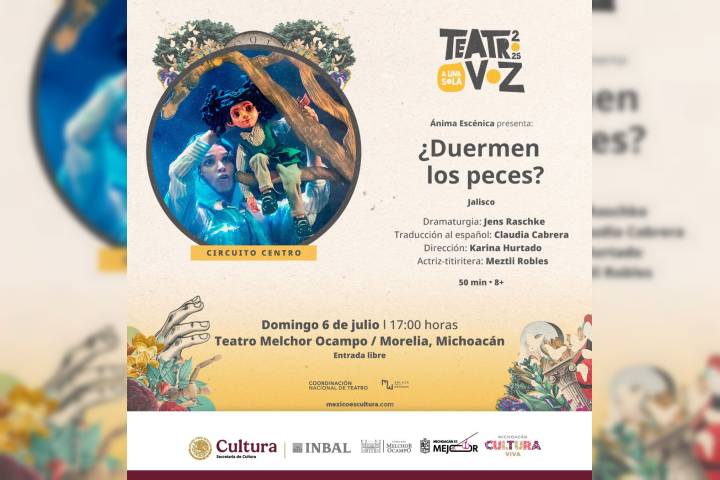 NOTICIAS 04/07/2025Festival de Monólogos inicia su viaje en Morelia: Secum Este domingo 6 de julio inicia en Morelia la vigésima edición del Festival de Monólogos "Teatro a Una Sola Voz", con la puesta en escena "¿Duermen los peces?", una obra que aborda el duelo infantil desde una perspectiva íntima y poética. La función será a las 17:00 horas en el Teatro Melchor Ocampo, con entrada libre.