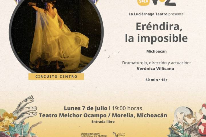 NOTICIAS 07/07/2025"Eréndira la Imposible" llega al Ocampo como parte del Festival de MonólogosComo parte del 20 Festival de Monólogos Teatro a una sola voz, llega a Morelia "Eréndira la Imposible", un montaje de la compañía michoacana La Luciérnaga Teatro, que se presentará mañana 7 de julio a las 19:00 horas en el Teatro Melchor Ocampo.