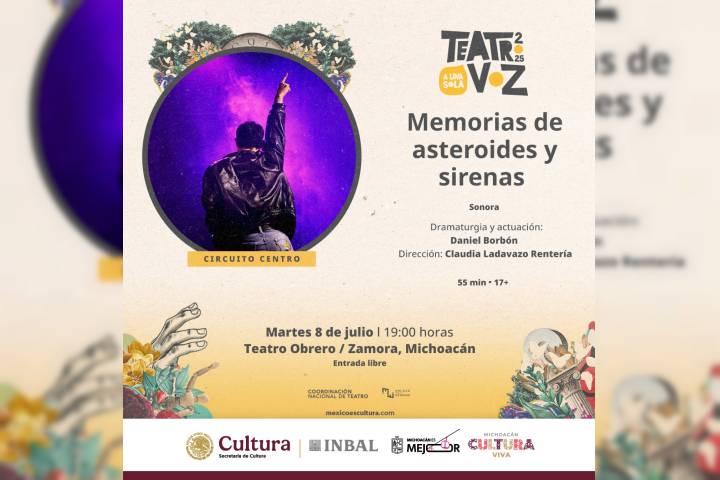 NOTICIAS 08/07/2025Llega a Zamora este miércoles el Festival de MonólogosEl Teatro Obrero de Zamora será sede del 20 Festival de Monólogos, Teatro a Una Sola Voz, con la presentación de Memorias de asteroides y sirenas, el 8 de julio a las 19:00 horas. La entrada es libre y está dirigida al público general.