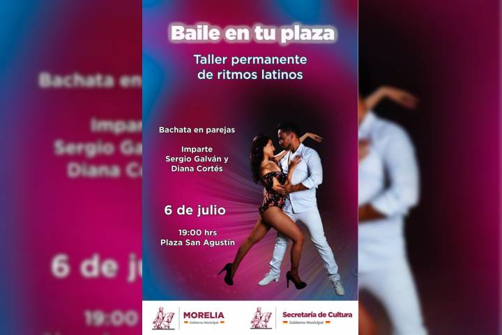 La cita es en la Plaza San Agustín a las 19:00 horas, informó Cardiela Amézcua Luna, secretaría de Cultura de Morelia, quien explicó, en esta ocasión el ritmo a bailar será bachata en pareja y los instructores serán Diana Cortés y Sergio Galván.
