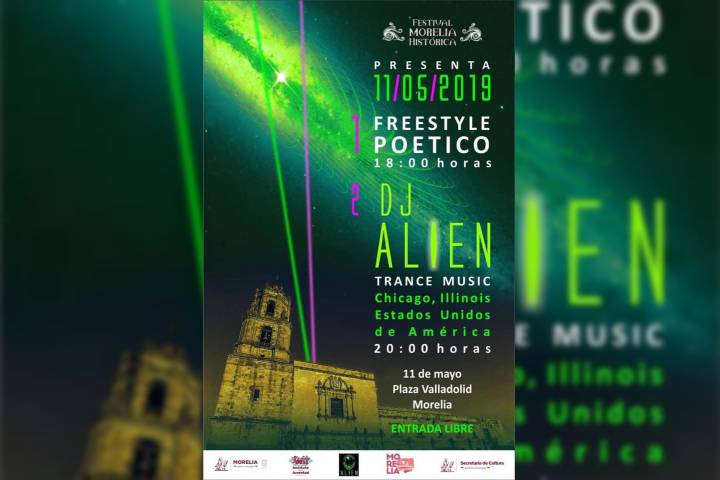 NOTICIAS 10/05/2019DJ Alien de Estados Unidos, y freestyle poético, este sábado en Morelia: SeCulturaDJ Alien, el primer artista internaciMorelia, Michonal que es parte del elenco del Festival Morelia Histórica, llega este sábado 11 de mayo a la Plaza Valladolid, detalló Cardiela Amézcua Luna, secretaria de Cultura de Morelia. Debido a esto previo al evento musical, SeCultura convoca a las personas que les guste improvisar a que participen en el freestyle poético que iniciará a las 18:00 horas.