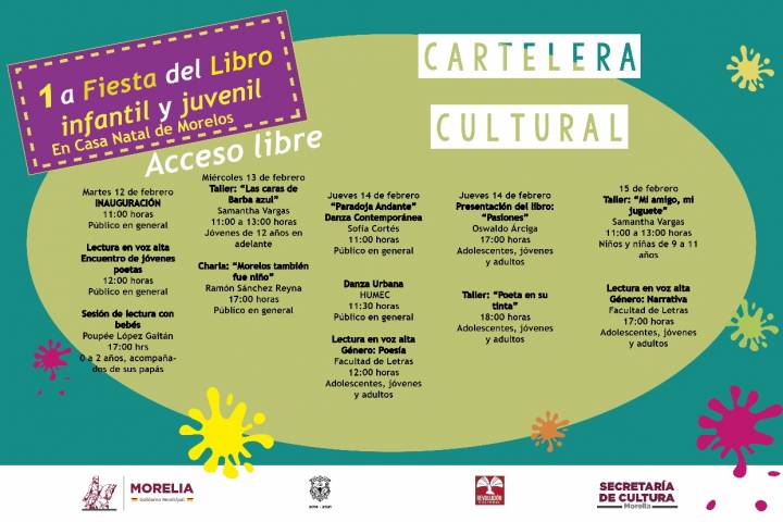 NOTICIAS 14/02/2019Invita SeCultura Morelia a disfrutar este fin de semana de la Fiesta del Libro Infantil y Juvenil La SecretarÃa de Cultura de Morelia inició el pasado 12 de febrero con la Primera Fiesta del Libro Infantil y Juvenil de Morelia en la Casa Natal de Morelos, lugar en el que hasta el momento más de 500 personas entre estudiantes y público en general ha acudido para observar la amplia gama de actividades que se integra en su programación y adquirir alguno de los libros que están a un costo desde los ocho hasta los 500 pesos.