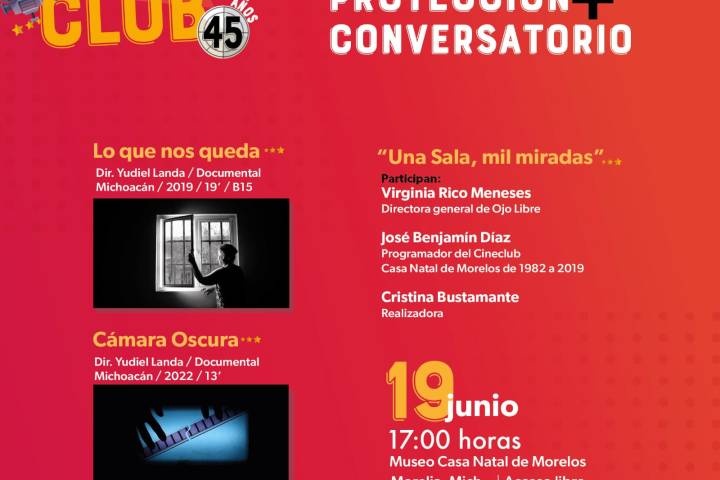 NOTICIAS 17/06/2025Cineclub Casa Natal de Morelos celebra 45 años de cine y memoria: SecumLa Secretaría de Cultura de Michoacán (Secum) invita a la celebración por los 45 años del Cineclub del Museo Casa Natal de Morelos, un espacio cinematográfico emblemático de la capital michoacana, con una función doble y un conversatorio este jueves 19 de junio a las 17:00 horas, con entrada libre.