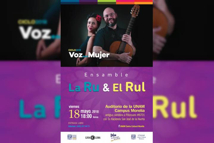En el marco del ciclo de conciertos Voz... Mujer, que organiza la UNAM Centro Cultural Morelia el tercer viernes de cada mes, este 18 de mayo se presenta el espectáculo La Ru & El Rul, acompañados por el percusionista Fernando Hernández.