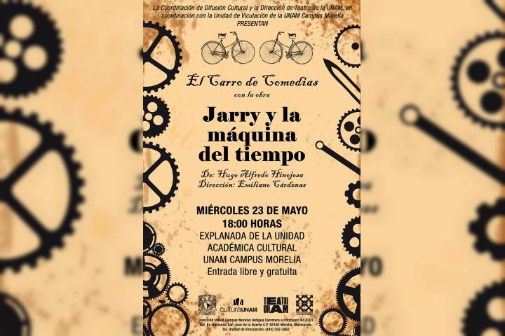 El próximo miércoles 23 de mayo, a las 18:00 horas regresa el Carro de Comedias de la UNAM a Michoacán con la obra Jarry y la Máquina del Tiempo, se presentará en la explanada de la Unidad Académica Cultural del Campus UNAM Morelia, ubicada en Antigua carretera a Pátzcuaro No. 8701, colonia Ex Hacienda de San José de la Huerta.