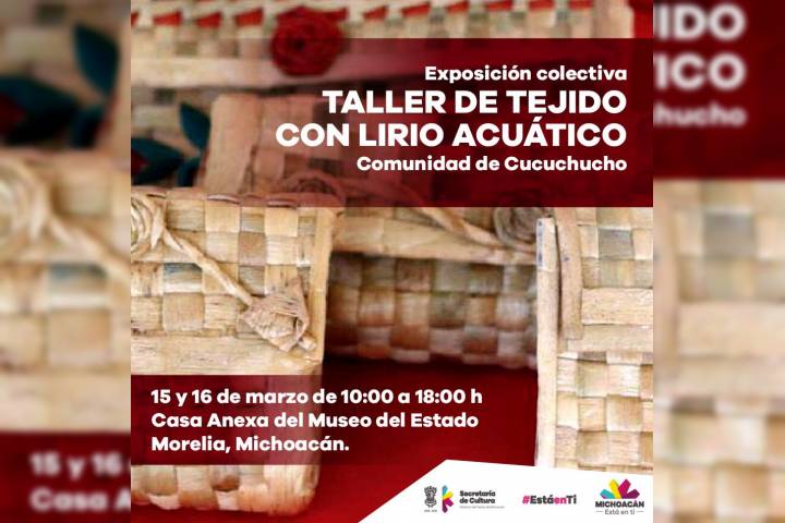 NOTICIAS 09/03/2018En el Museo del Estado, los resultados del Taller de tejido con lirio acuático La Secretaría de Cultura de Michoacán (Secum) y el grupo artesanal T'sipintekua, realizarán la muestra de resultados del proyecto "Taller de tejido con lirio acuático", de la comunidad de Cucuchucho, los días 15 y 16 de marzo a partir de las 10:00 horas, en la Casa Anexa del Museo del Estado.