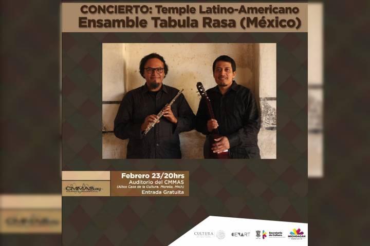 NOTICIAS 22/02/2018Mañana en el CMMAS, flauta, guitarra y electrónica con sabor latinoEl Centro Mexicano para la Música y las Artes Sonoras (CMMAS) presenta este viernes el concierto "Temple Latino-Americano" a cargo del Ensamble mexicano Tabula Rasa. La cita es a partir de las 20:00 horas en el Auditorio del espacio, ubicado en la planta alta de la Casa de la Cultura de Morelia.