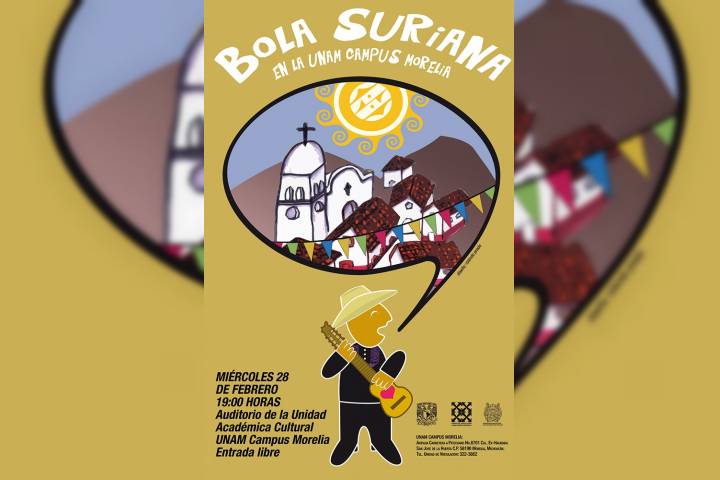 El próximo miércoles 28 de febrero se presenta en la UNAM Campus Morelia la agrupación musical Bola Suriana, a las 19:00 horas, en el Auditorio de la Unidad Académica Cultural del Campus, con entrada libre y gratuita.