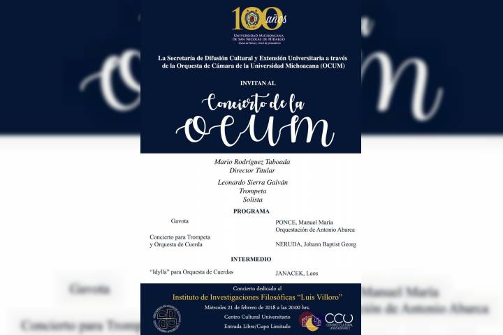NOTICIAS 19/02/2018OCUM dedica concierto al Instituto de Investigaciones Filosóficas de la UMSNH