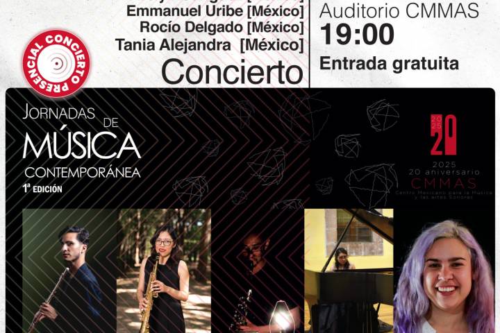 NOTICIAS 23/05/2025CMMAS presenta la Primera Jornada de Música Contemporánea La Secretaría de Cultura de Michoacán (Secum) invita a disfrutar de la Primera Jornada de Música Contemporánea, un concierto que abrirá nuevas rutas de escucha este viernes 23 de mayo a la 19:00 horas en el auditorio del Centro Mexicano para la Música y las Artes Sonoras (CMMAS), ubicado en la Casa de la Cultura de Morelia. La entrada será gratuita, con cupo limitado.