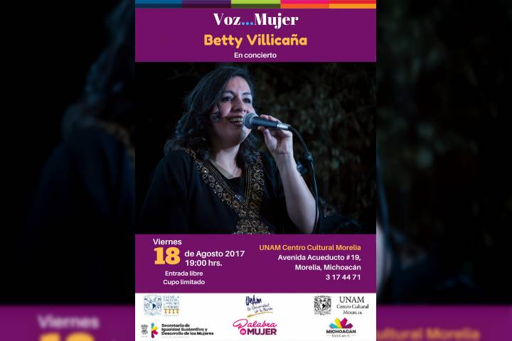NOTICIAS 14/08/2017Betty Villicaña en concierto en la UNAM Centro Cultural Morelia Con el apoyo de la Secretaría de Igualdad Sustantiva y Desarrollo de las Mujeres Michoacanas, este viernes 18 de agosto se presenta la interprete Betty Villicaña en concierto, como parte del Ciclo "Voz.. mujer".