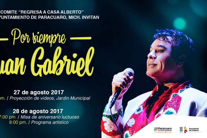NOTICIAS 23/08/2017Anuncia Secum homenaje a Juan Gabriel, en su primer aniversario luctuosoAlberto Aguilera Valadez, mejor conocido como Juan Gabriel, será recordado en Parácuaro este domingo 27 y lunes 28 de agosto con una serie de actividades artístico, culturales, gastronómicas y más eventos, todo con motivo del primer aniversario luctuoso de uno de los artistas más prolíficos de los últimos tiempos en México.